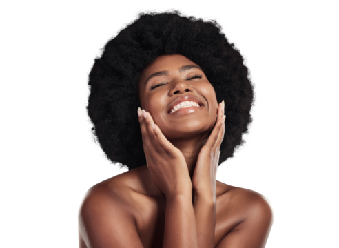 Hair, beauty and happy black woman with afro on isolated, png and transparent background. Skincare, aesthetic and face of African person smile with natural texture, growth and cosmetics for wellness
