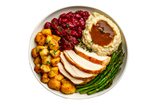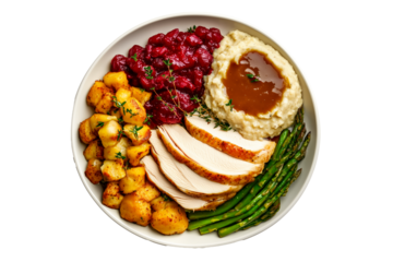 Plate of Thanksgiving dinner featuring turkey slices, roasted potatoes, cranberry sauce, mashed potatoes, and asparagus isolated on white transparent background. Concept of festive meal