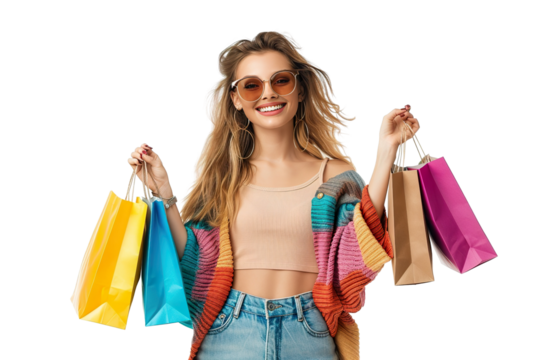Woman holding colorful shopping bags with transparent background