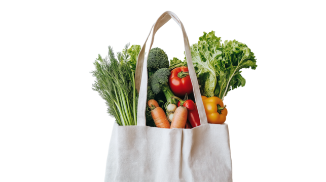 Shopping bag filled with groceries, fresh vegetables and fruits peeking out, healthy food shopping concept, isolated on a white background