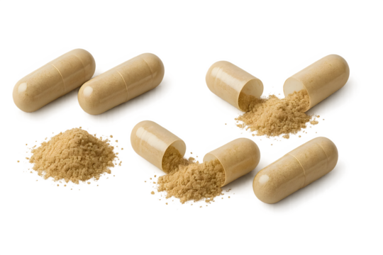 Brown capsules with some open, revealing powder inside, along with small piles of the powder on a surface. Concept Brown Capsules, Open Capsules, Revealed Powder, Powder Piles