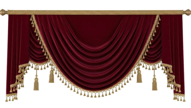 Elegant burgundy velvet swag curtain with gold tassels isolated PNG, luxurious window treatment for theater or formal event decor