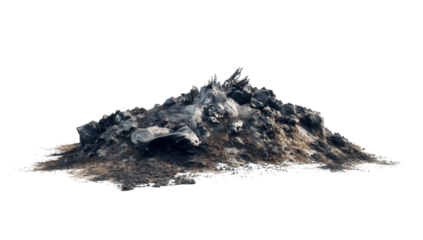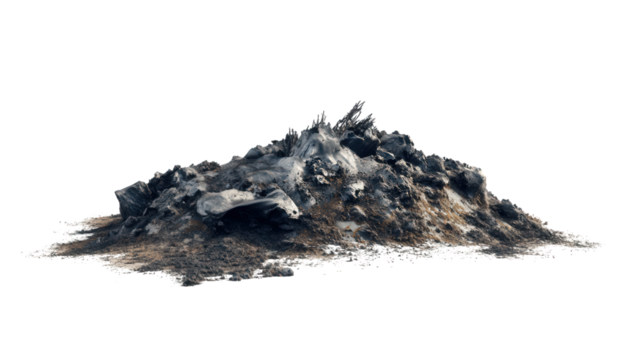 A desolate pile of ash and debris, symbolizing destruction and the aftermath of fire, isolated on transparent background, conveying a sense of loss