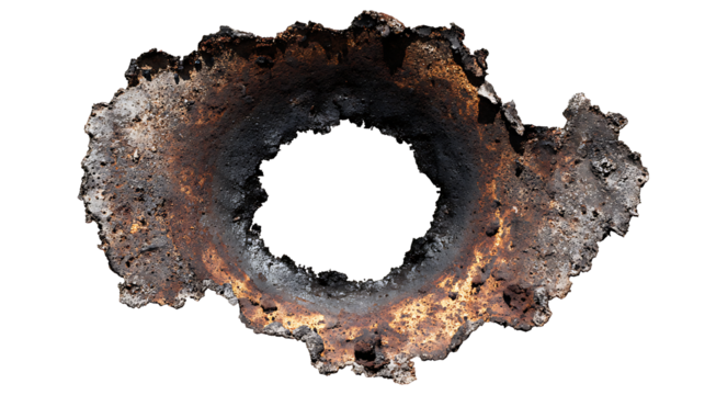 Burned metal hole with scorched edges and heat damage texture, explosion aftermath graphic element, isolated on a white background.