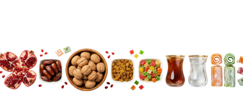 Assortment of Turkish Delight, Nuts, Dates, Pomegranate, and Tea Glasses