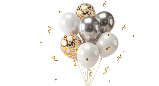 Gold and white balloons bouquet with confetti and silver balloons for festive celebrations and party decoration