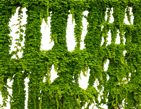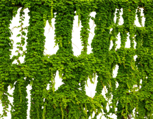 Lush green vines cascade down a textured wall with shadowy gaps