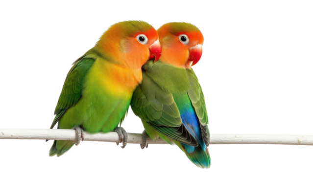 Two Vibrant Green and Orange Lovebirds Perched on a Stick isolated PNG with Transparent Background