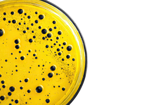 Petri dish with yellow agar and dark colonies.  Dark round colonies are dispersed across a bright yellow agar surface.  Petri dish is circular