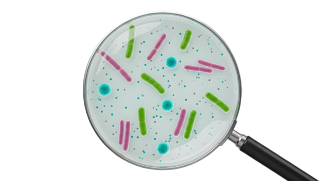 Bacteria under a magnifying glass close up view on transparent background, png