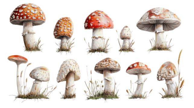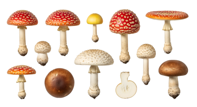 Three vibrant fly agaric mushrooms showcasing intricate details, isolated on transparent background