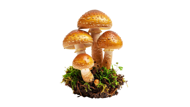 Group of Golden Mushrooms Growing on Bark Isolated on Transparent Background Macro Shot Detailed Texture and Delicate Gills Natural Light Wild Fungi