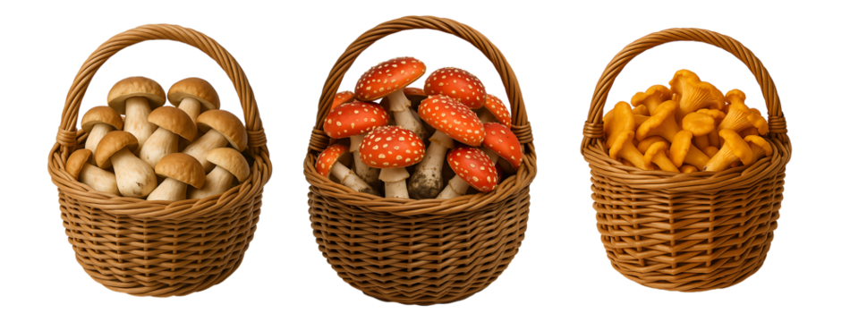 set of three wicker baskets filled with different types of mushrooms. the basket contains porcini mushrooms. the basket is filled with bright fly agarics with red caps. the basket is filled with golde