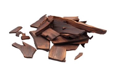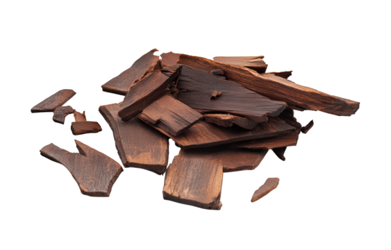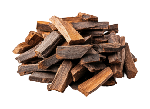 Pile of fragrant agarwood chips isolated on transparent background, showcasing the natural beauty and aromatic qualities of this precious resinous wood used in incense