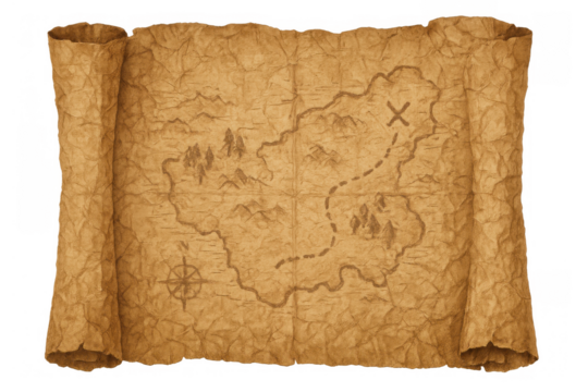 Old treasure map scroll with 'x' marking the spot for adventure and discovery on transparent background
