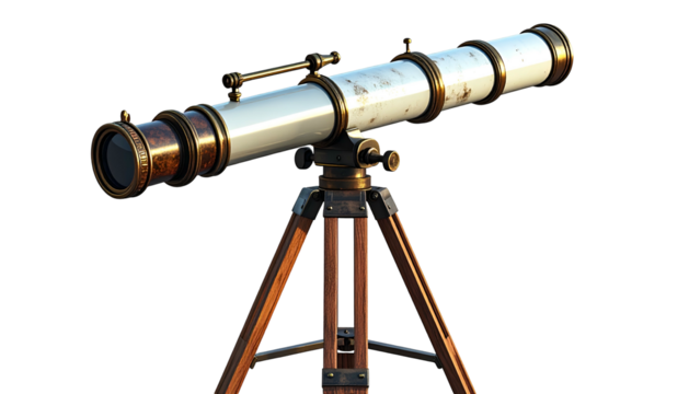 A vintage brass and white telescope rests on a wooden tripod. Detailed and aged appearance