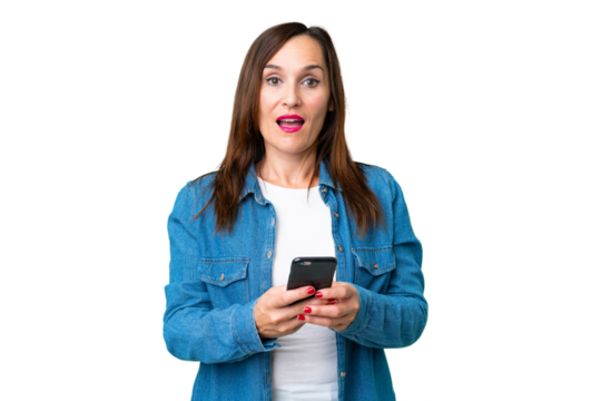 Middle age woman over isolated chroma key background surprised and sending a message