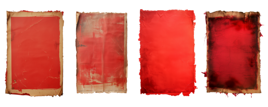 Four aged and distressed pieces of red-colored parchment paper isolated on a transparent background, ideal for vintage or historical presentations