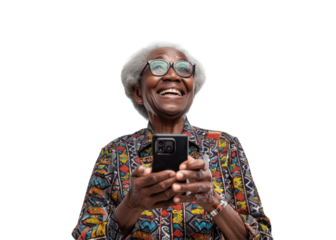 Happy middle aged mature black woman, senior older 50 year lady looking at camera touching her face isolated on white close up face portrait PNG