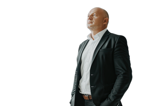 Portrait of a middleaged bald caucasian man with blue eyes, looking directly at the camera, isolated on transparent background
