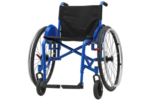 Isolated blue wheelchair, disability assistance aid with black seat for mobility support