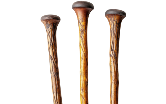 Three antique wooden walking canes with carved handles isolated on transparent background
