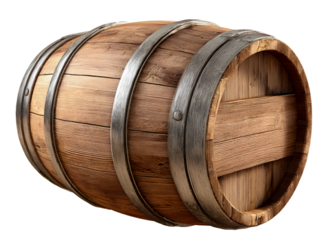 Rustic wooden barrel, light brown oak staves, intricate wood grain, dark weathered metal hoops, on pristine plain white background, 3/4 view. Concept of artisanal craftsmanship