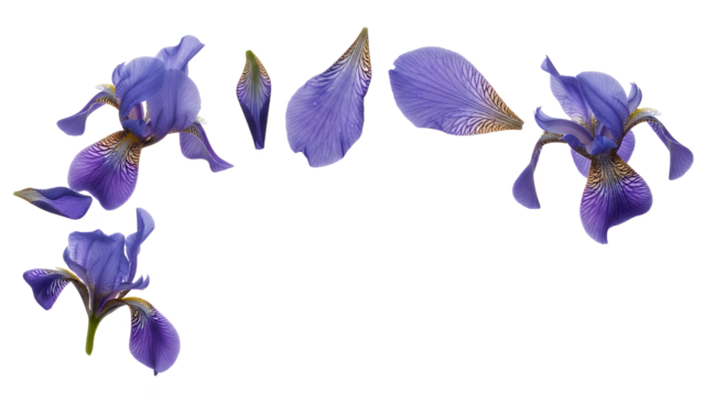 Close-up view of a dissected blue iris flower showcasing its delicate petals and stamens against a white background