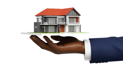 Real estate agent holding a model of a modern house on a tray. Isolated on transparent background, png