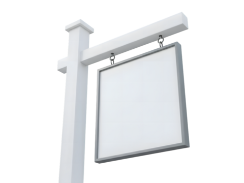 Blank White Square Real Estate Sign Post Isolated on White Background. Hanging For Sale Board Mockup.