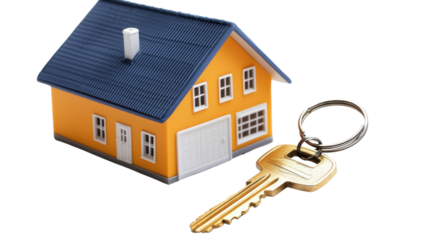 Wooden house keychain representing real estate, investment, and ownership, isolated on transparent background