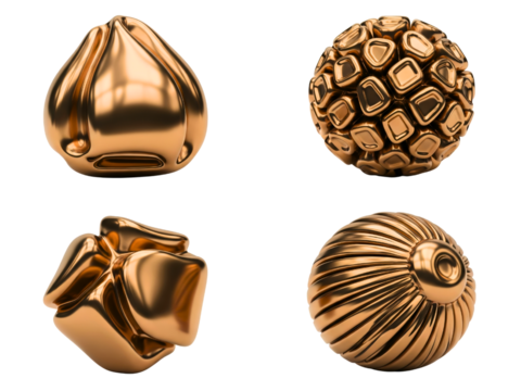 Collection of decorative bronze geometric shapes and spheres on a transparent background