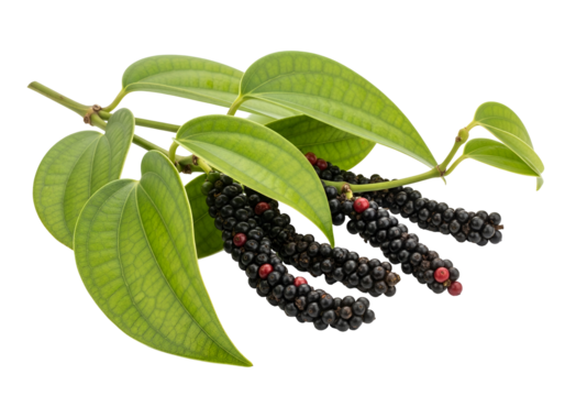 Close-up of Black Peppercorns and Green Pepper Leaves on a Black Background