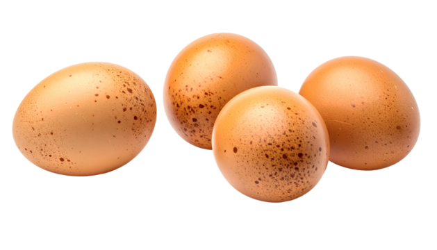 Close-up of four speckled, brown eggs, isolated on black background, soft lighting