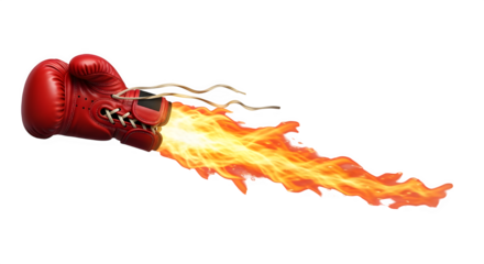 Red boxing glove punching fire breath with teeth isolated on transparent background