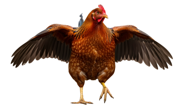 Brown hen standing on one leg with wings spread wide in a defensive or aggressive posture against a plain white background.
