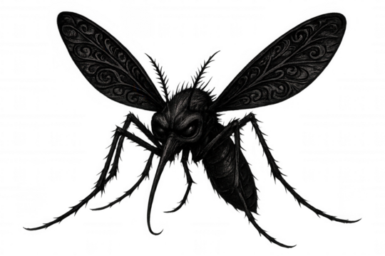 Black plague mosquito creature with detailed wings hovering, conceptualizing evil insect and disease vector