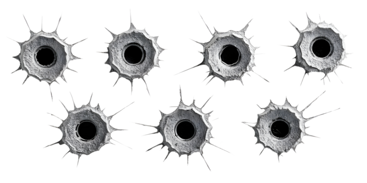 Collection set of metal bullet holes isolated on transparent or white background