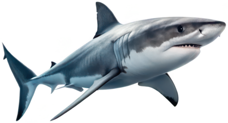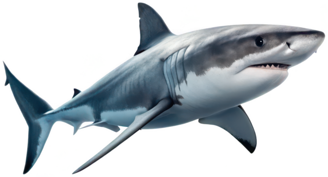 Photorealistic 3D rendered great white shark with detailed scales and sharp teeth, captured in a dynamic swimming pose with visible gill slits and a slightly, isolated on transparent background.
