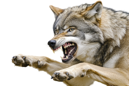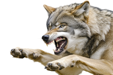 Ferocious, detailed portrait of a gray wolf with thick, wiry fur and sharp, prominent teeth, captured in a dramatic snarling pose with an intense gaze,, isolated on transparent background.