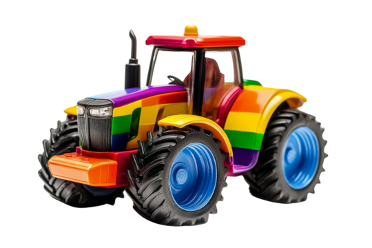 Colorful toy tractor with a vibrant rainbow design, perfect for children's playtime and imagination.