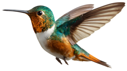 Vibrant hummingbird isolated on transparent background, in flight with wings spread, showcasing detailed plumage and colorful iridescent feathers