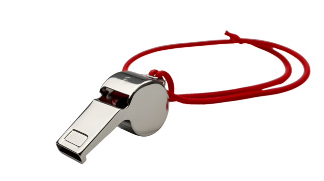 A silver whistle with a red cord on a black background