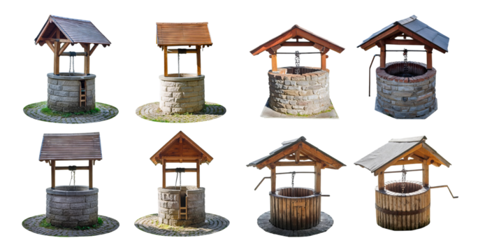 Various Traditional Water Wells with Different Structures and Designs, isolated on transparent background