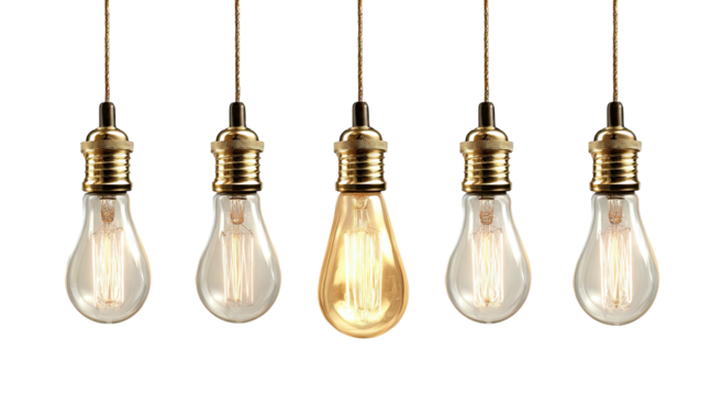 Five vintage lightbulbs hang against a stark black background, one bulb aglow