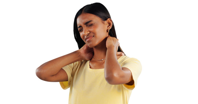 Indian woman, neck pain and spine injury with healthcare, medical emergency and fibromyalgia on png transparent background. Agony, hurt and sick with muscle tension, pressure and inflammation