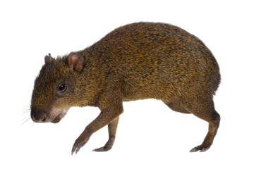Agouti aka Dasyprocta walking side ways with nut in mouth. Looking ahead and away from camera. Isolated cutout on a transparent background.