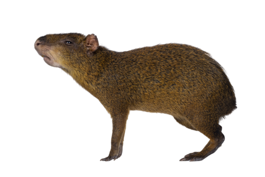 Agouti aka Dasyprocta standing side ways. Looking ahead and away from camera. Nose up smelling. Isolated cutout on a transparent background.