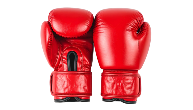 Vivid red boxing gloves, set against a black backdrop, showcasing details of leather and stitching