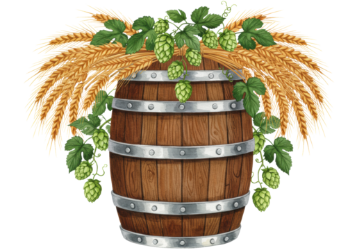 Highly detailed traditional watercolor of a rustic aged wooden barrel with silver hoops, adorned with cascading golden wheat and emerald hops against a transparent background. Concept of harvest